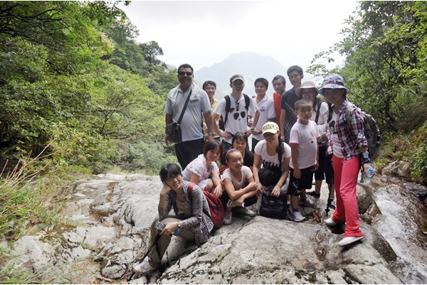 经过7、8个多钟头的不断上坡下坡,大汗淋漓、筋疲力尽的时候后我们终于在到达了风景开发区的阶梯,因为还要回长沙,周一要上班的原因。我们放弃了爬上金顶,一个个都腿脚如灌铅了一样,下山脚痛的厉害。相比如之前的爬坡下坡,这样一 **一 **的台阶,似乎上下的更为辛苦。